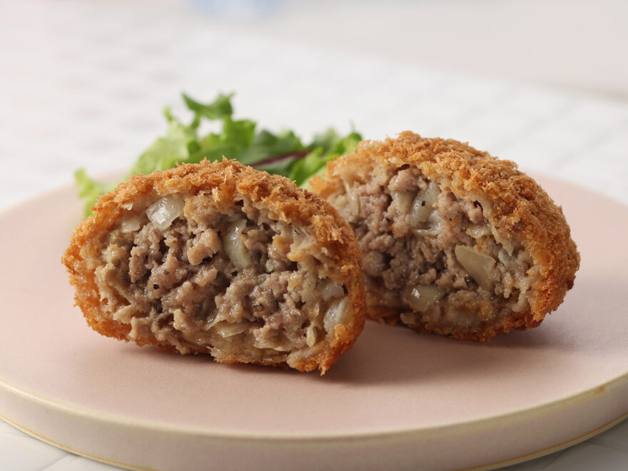 2層構造の厚みのある生地で、肉の旨みと食感にこだわった牛豚合挽きメンチカツです。 肉汁を閉じ込めたジューシーさ、噛み応えとほぐれ感のある食感をお楽しみください。