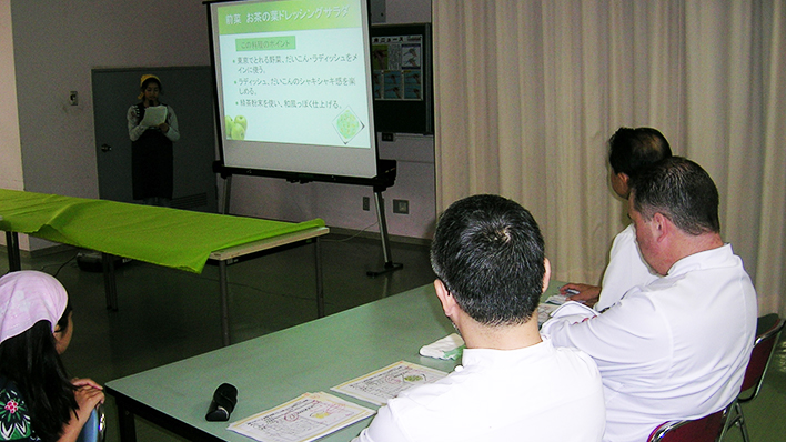 パソコンとプロジェクターを使って、緊張しながら参加シェフへ考案者がメニューを発表。